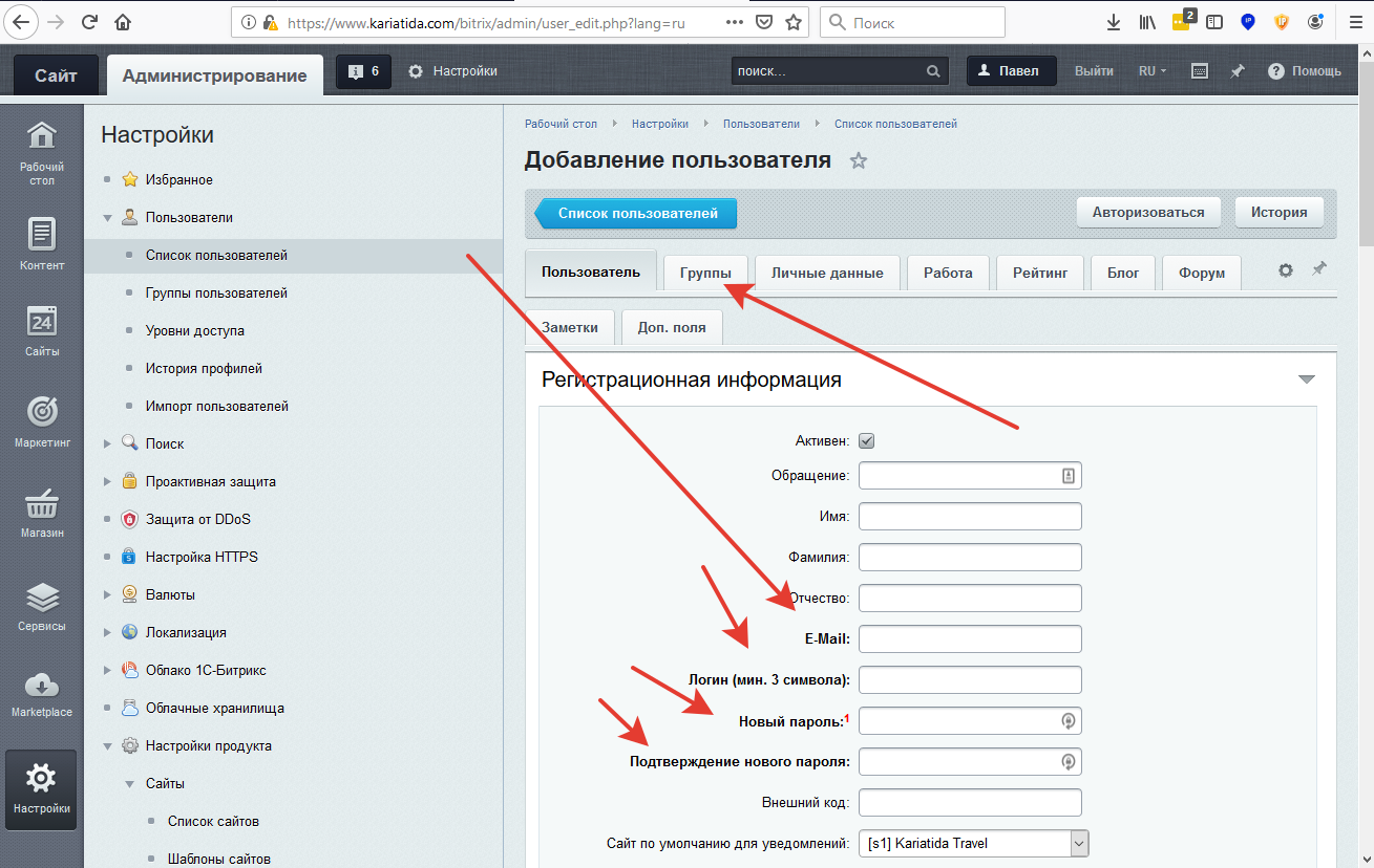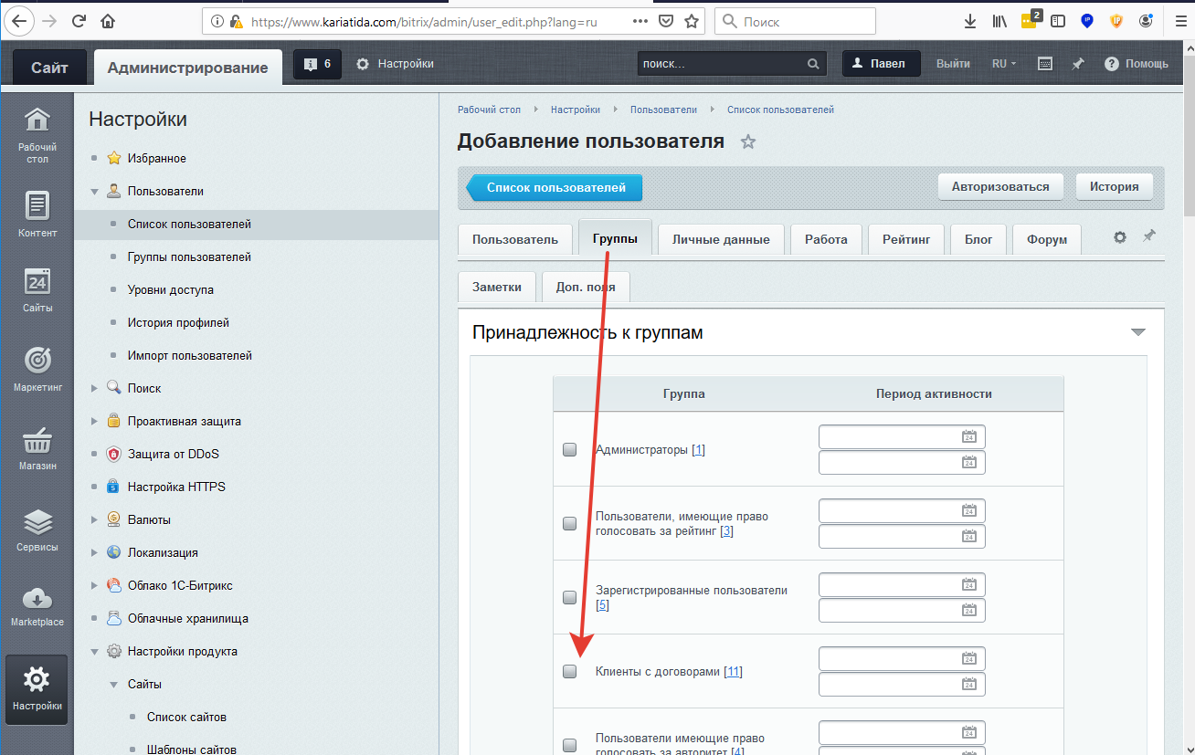 После заполнения данных по пользователю, НАДО перейти во вкладку Группы и там указать