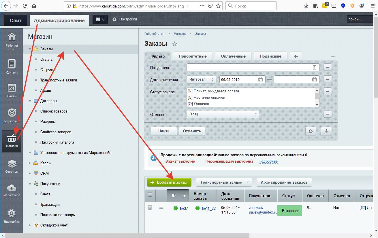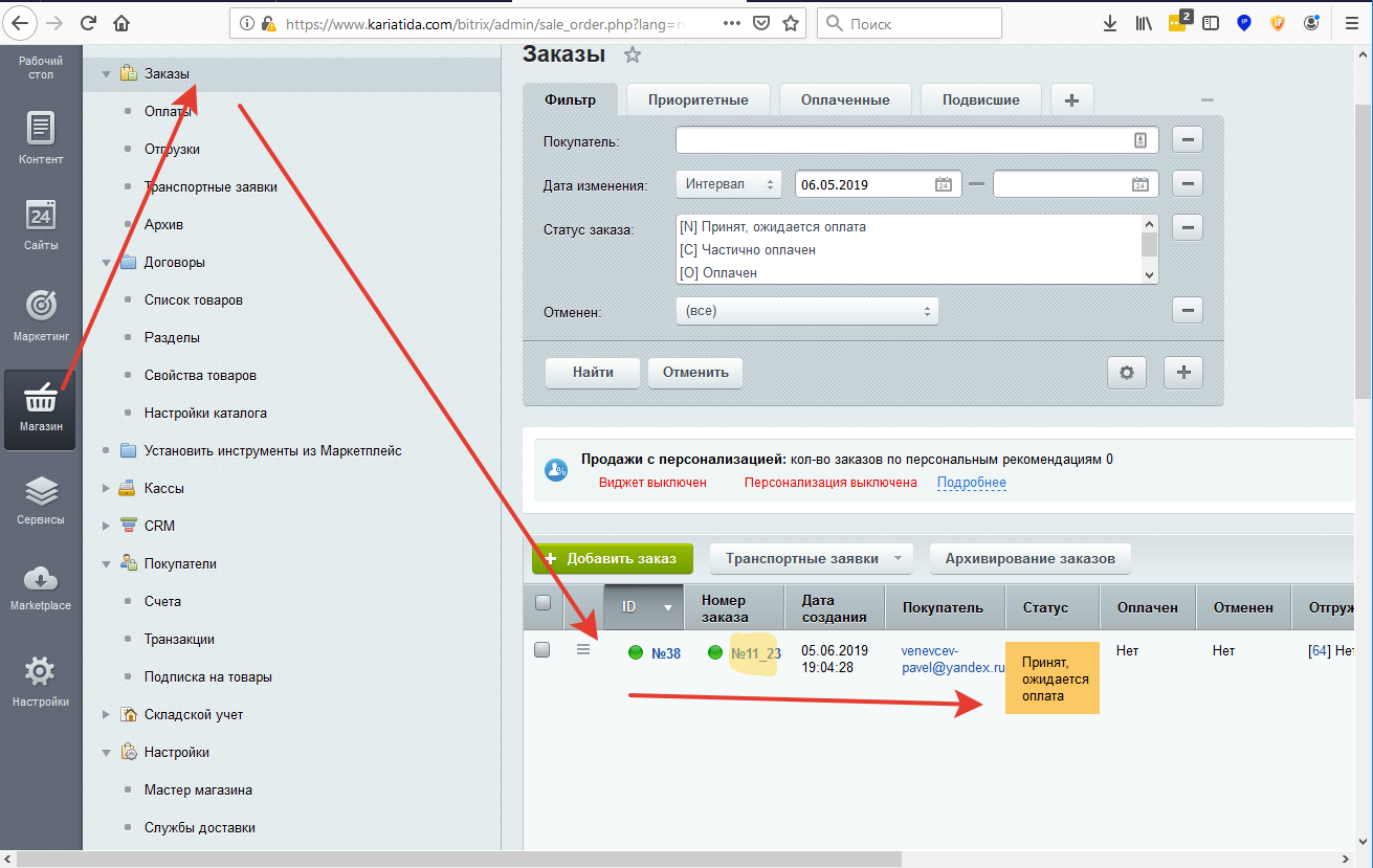 После нажатия кнопки Сохранить, у нас откроется список заказов. Свежий, только что соданный заказ, будет помечен лейблом Принят, ожидается оплата