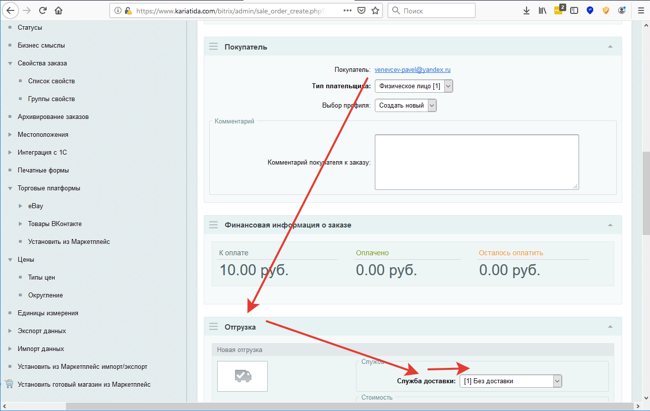 Опускаемся ниже, в блоке Отгрузка выбираем из списка пункт