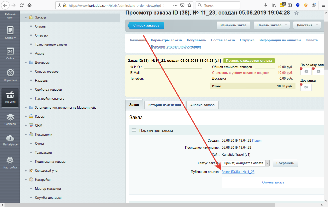 После проведения всех действий по созданию клиента, договора и заказа, нам необходимо передать клиенту ссылку.